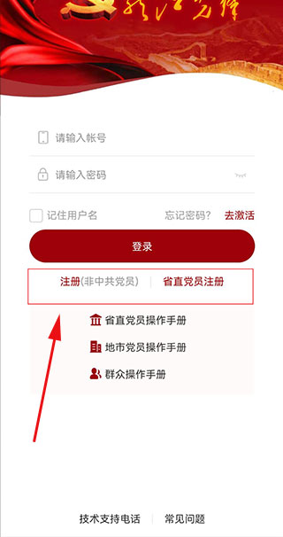 2、進(jìn)入登錄界面,有非中共黨員和省直黨員注冊兩個(gè)選項(xiàng),根據(jù)自身選擇;