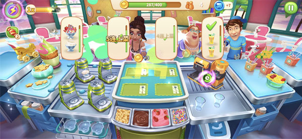 當你把所有顧客需要的菜做好之后,一下子全發(fā)給他們,你會發(fā)現(xiàn)連連上菜的標志,這就代表了你完成了連連上菜!