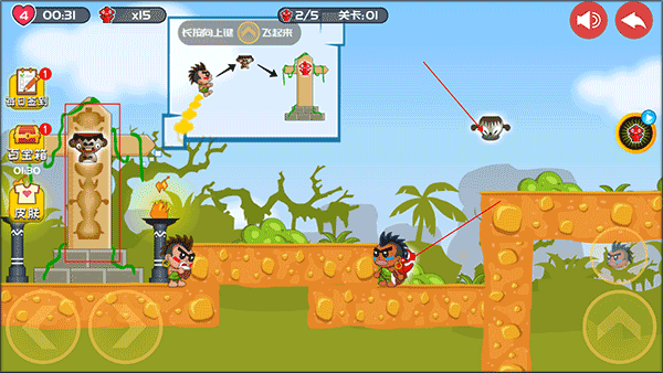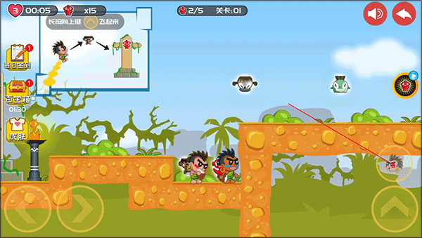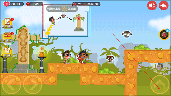 1、下載安裝好屁王兄弟雙人版,進入游戲,長按如圖所示的鍵可以讓角色飛起來。