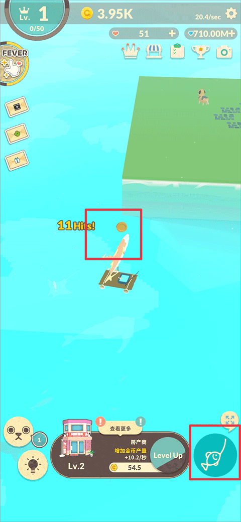 3、想要將小島發(fā)展到越大,金幣是必不可少的,玩家通過一直點擊右下角釣魚按鈕即可獲得豐富金幣獎勵