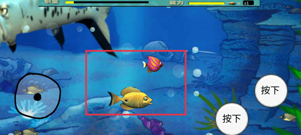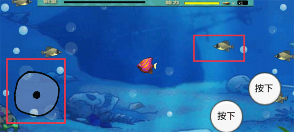 3、觸屏操控小魚前進(jìn),遇到比自己小的魚就吞噬,讓玩家在游戲中體驗捕食的樂趣。
