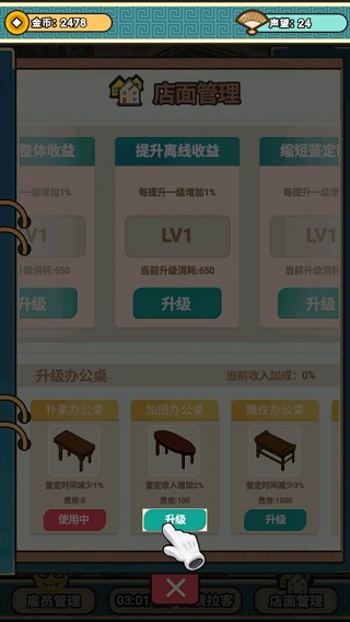 最后,讓我們了解一下店面管理,在店面管理中可以升級辦公桌,點擊“店面管理”。