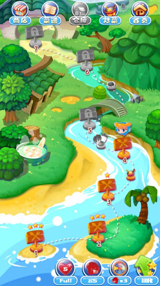 三星獲得條件是:過關(guān)、吃貨妹子10滴血一滴沒掉、完成任務(wù)。