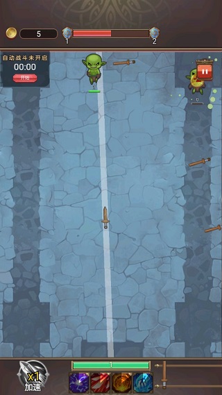 以下便是勇者大人攜帶的武器,武器將會根據(jù)順序依次射出,而光標(biāo)所指的方向即是劍射出的軌跡,還請勇者大人移動光標(biāo)消滅怪物。