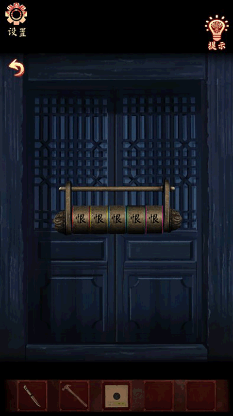 9、(戲院外-后門)點擊門上的密碼鎖,根據(jù)上面的顏色(紅黃藍(lán)綠紫),結(jié)合墻上的線索(霸-黃色、恨-綠色、楚-紅色、魂-藍(lán)色、漢-綠色),調(diào)整密碼鎖為:楚霸魂恨漢,打開門,進入戲院