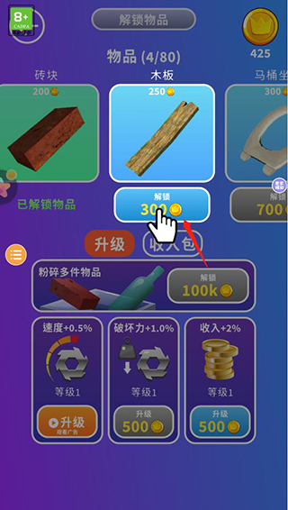 7、另外還可以升級粉碎機的速度、破壞力和收入以達到最高的粉碎性能!