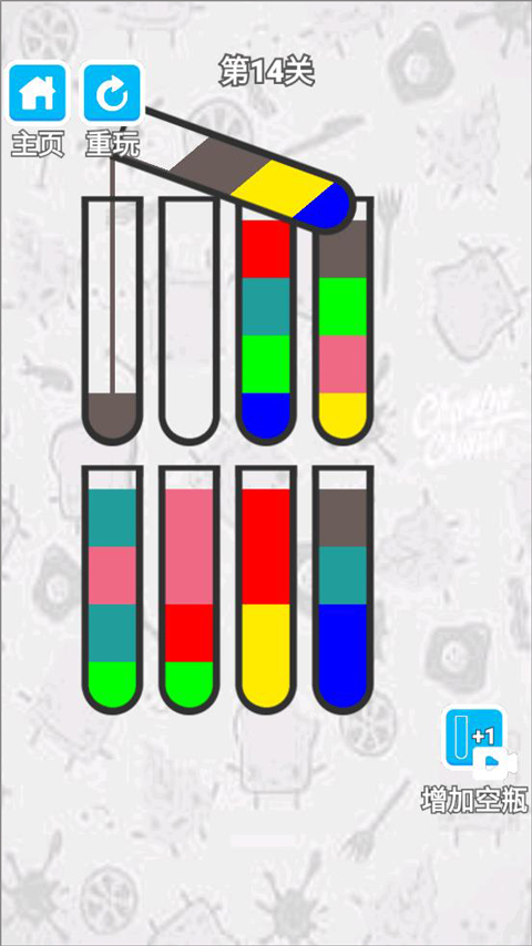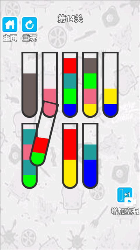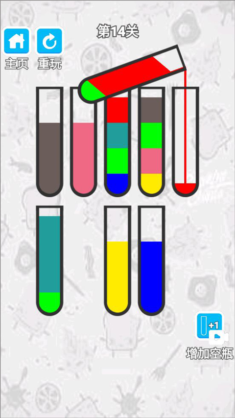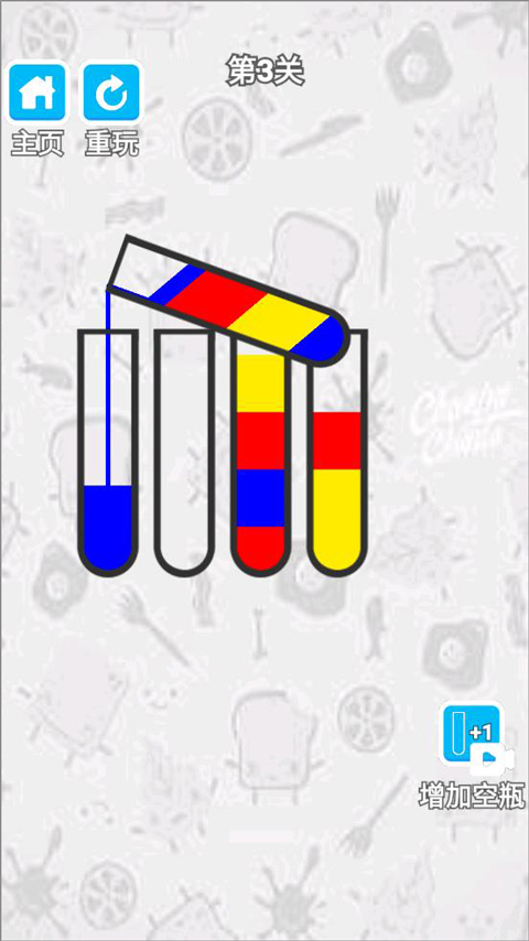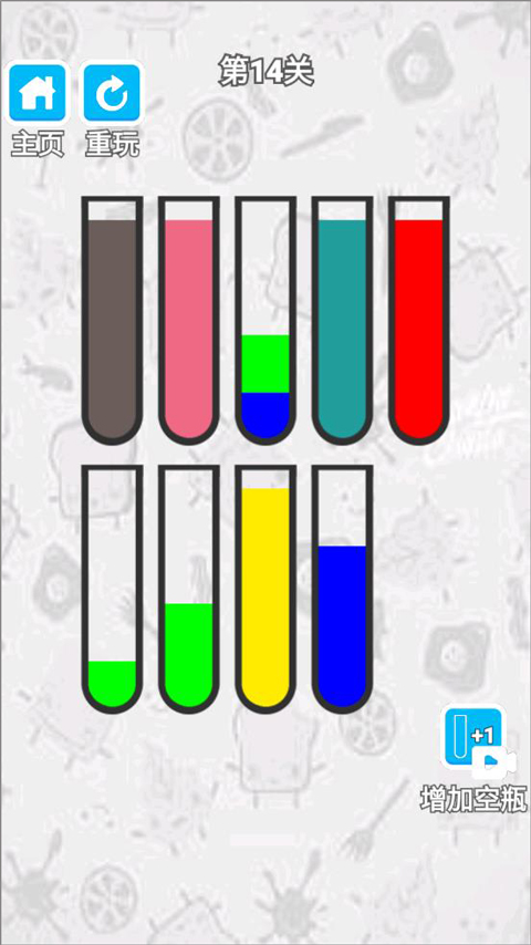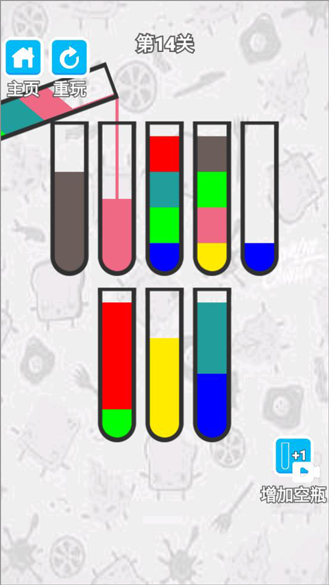 2、玩家點擊瓶子將同一顏色的液體放到一個瓶子里;