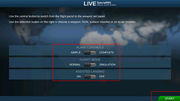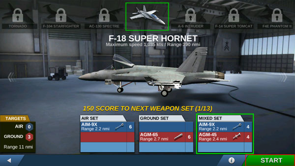4、接下來就是選擇戰(zhàn)斗機了,選擇飛機類型和導(dǎo)彈,點擊“START”開始游戲。