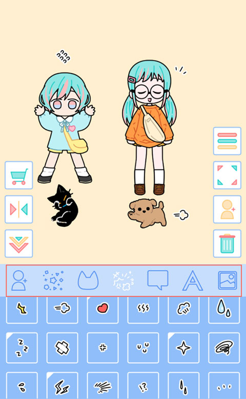 4、進(jìn)到頁(yè)面先點(diǎn)擊下方的已經(jīng)搭配好的女鵝將她放到屏幕上,再次點(diǎn)擊下方的女孩可以添加多個(gè)角色到屏幕中。長(zhǎng)按可拖動(dòng)角色,往下滑至垃圾桶按鈕可刪除角色。返回主界面的話只需點(diǎn)擊右方第三個(gè)按鈕。
