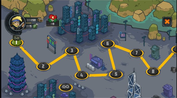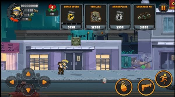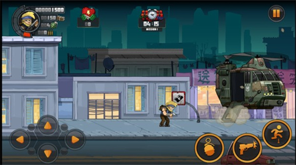 3、進入游戲關(guān)卡,通過移動角色,跳躍和攻擊,使用不同的槍和手榴彈可以快速的消滅敵人。