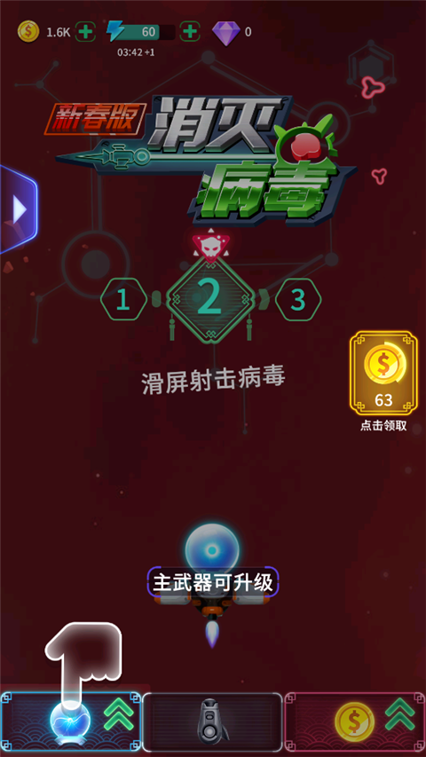 1、進入游戲后,在左上方可以看到當前金幣的數(shù)量,新春版看起來也是非常的喜慶的,滑屏射擊病毒即可開始游戲。