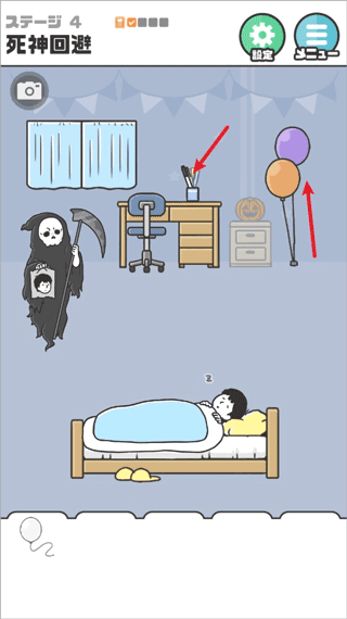 從桌子上拿到馬克筆,和旁邊的氣球,兩者組合后會(huì)獲得一個(gè)人臉氣球,將氣球放到人的身上,死神就會(huì)誤以為是本人帶走,這樣就順利過關(guān)了。