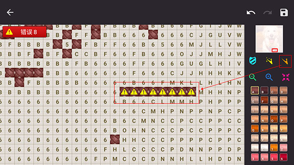 5、如果繡錯了也不要緊,游戲會提示錯誤的個數,我們使用右邊的清除工具,連續(xù)點擊錯誤格子數就能清除掉了;