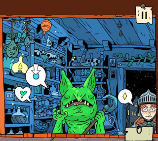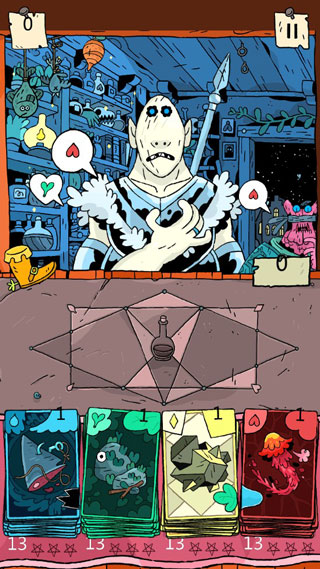 學(xué)會(huì)制作藥水之后,接下來(lái)玩家便可開(kāi)啟商店完成營(yíng)業(yè)了,記住來(lái)到這里的每個(gè)客戶(hù)都有特殊的訂單,其中上面的文字泡泡顯示了它想要的藥水原料,你必須至少使用1張客戶(hù)想要的配料卡,否則游戲結(jié)束,