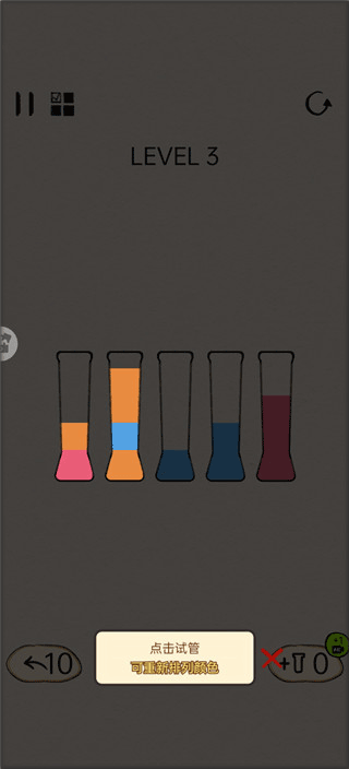 3、完成游戲,進(jìn)入下一關(guān),每一關(guān)的目標(biāo)都不同,你需要將它們依次的按同一個(gè)顏色的水倒入同一個(gè)管子里,完成任務(wù)才算通過。