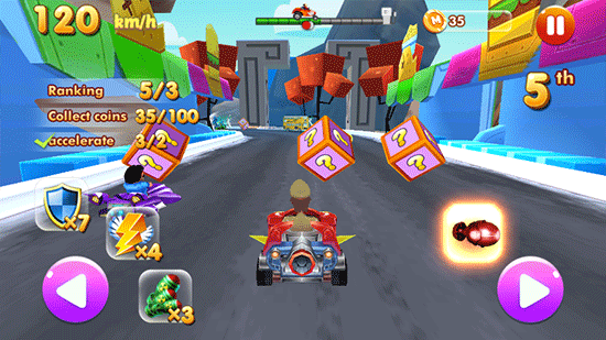 2、在行駛過(guò)程可以任意點(diǎn)擊左右控制鍵旁邊的火箭、箱子等特殊技能進(jìn)行加速、變形,超越其他賽車。
