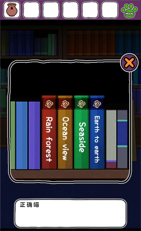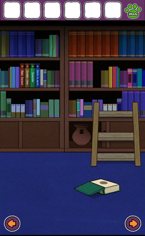 4、進入下層后直接向右,到達全是書的房間,打開書柜底部,獲得畫著章魚的陶罐。
