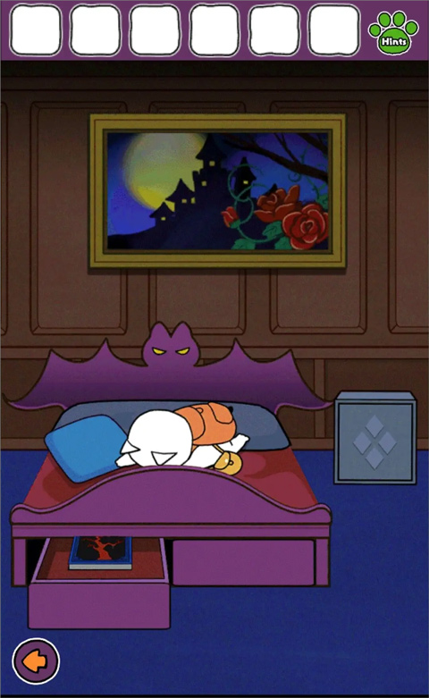 5、向右前往有床的房間,點開床鋪左下角抽屜,獲得一本書,把書放書架上空缺的位置。
