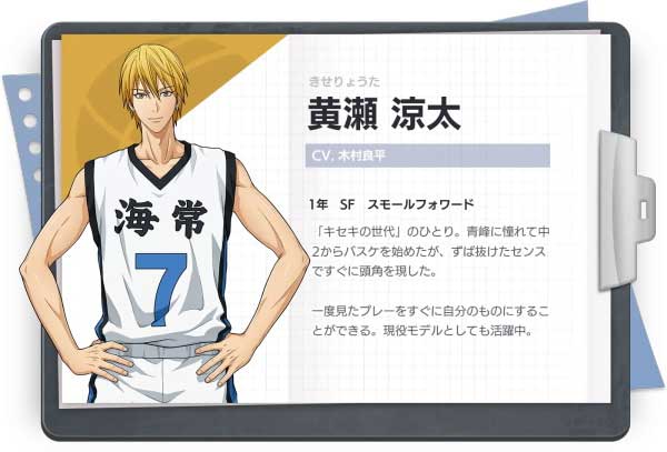 原帝光中學籃球部「奇跡的世代」中一人,現(xiàn)就讀于海常高校一年級,海常籃球部的王牌。被黑子哲也稱“海常的黃瀨同學是最棒的選手”。