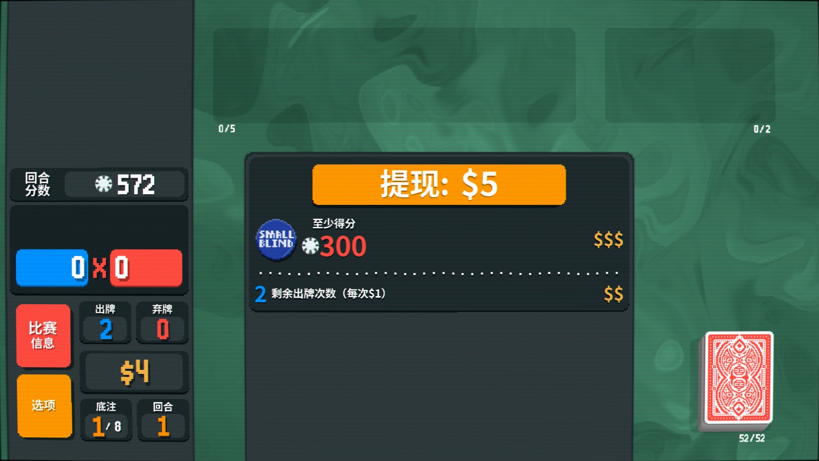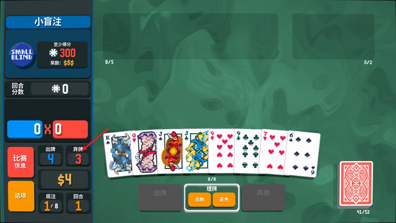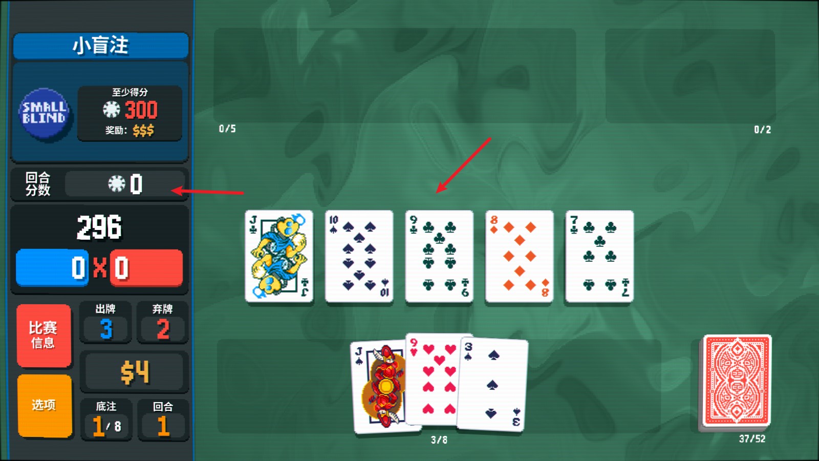 4、左側可以看到可以出牌和棄牌的次數,我們需要在出牌次數用完前達成指定分數。