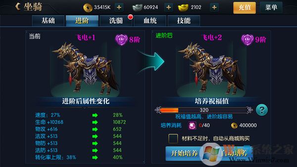 坐騎系統(tǒng),坐騎可以進(jìn)行升階,升階需要消耗一定數(shù)量的坐騎進(jìn)階丹,商城有出售,在進(jìn)階的時(shí)候,玩家可以選擇自動(dòng)購(gòu)買坐騎進(jìn)階丹,坐騎進(jìn)階不但為玩家提供屬性加成,還會(huì)解鎖新的形象,坐騎階數(shù)越高。洗髓時(shí)可以洗髓的百分比也越高,洗髓直接為玩家增加屬性,小編非常喜歡這一項(xiàng)。坐騎還有不同的血統(tǒng)可供玩家選擇,不同的血統(tǒng)成長(zhǎng)加成也不同,適合不同的職業(yè),玩家可以選擇最適合自己職業(yè)的血統(tǒng)來(lái)進(jìn)行培養(yǎng)。血統(tǒng)品階越高,坐騎的基礎(chǔ)屬性,成長(zhǎng)率和轉(zhuǎn)換率也會(huì)越高,特別推薦。還有坐騎技能,技能有直接為加成和加成到坐騎兩種,坐騎技能的品質(zhì)越高加成也越高,玩家可以嘗試刷新坐騎技能來(lái)獲得更好的品質(zhì)加成。