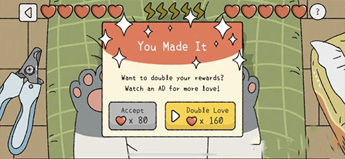 每只貓都有三種不同玩法,一次性可以產(chǎn)出480愛心,然后到了600愛心就繼續(xù)買貓。這樣玩的第一天就可以把所有貓買齊,一共是12只,就有了穩(wěn)定的愛心產(chǎn)出來(lái)源。