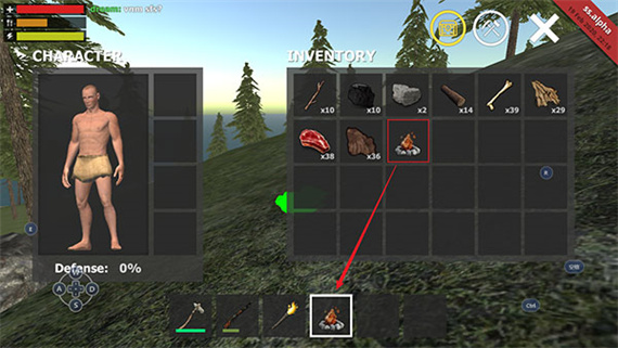 6、搭建完成后,可以在INVENTORY中看到一個營火圖標,拖動這個圖標到石斧等一行的那6個小框框中。