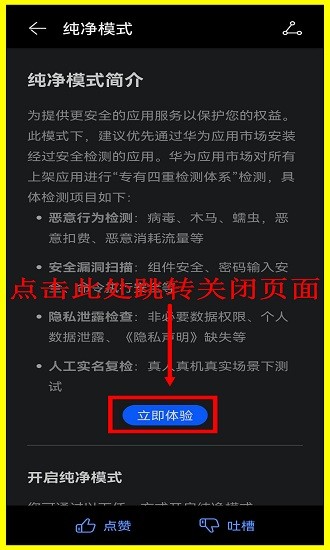 2.此處為純凈模式介紹,點擊下方(立即體驗)跳轉(zhuǎn)關(guān)閉頁。