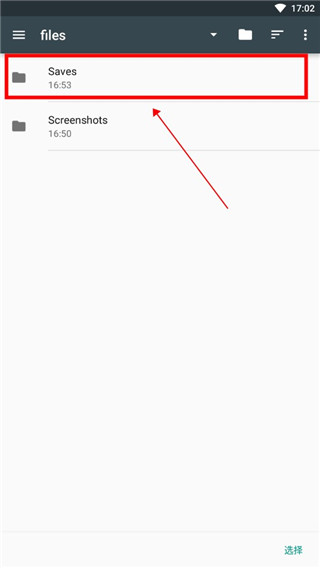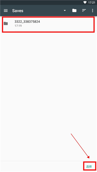 8、點擊進(jìn)入后就可以看到我們剛才在游戲中建立的存檔了,然后點擊下方的【選擇】,不同的手機(jī)也有可能提示的是【是否允許訪問該文件夾】,這不影響使用,點擊同意即可。