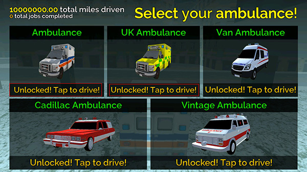 2、游戲已經(jīng)修改為解鎖全部救護(hù)車,玩家可以隨意挑選救護(hù)車。