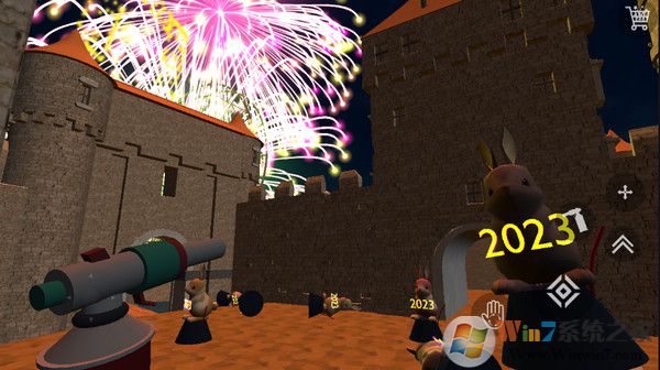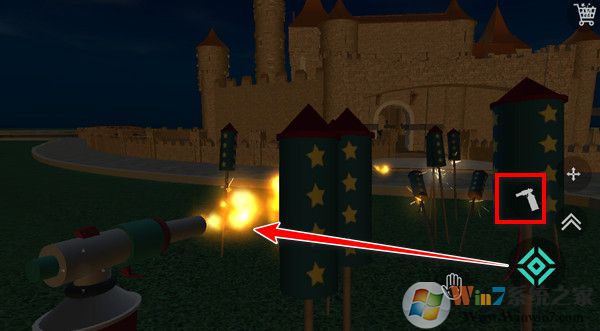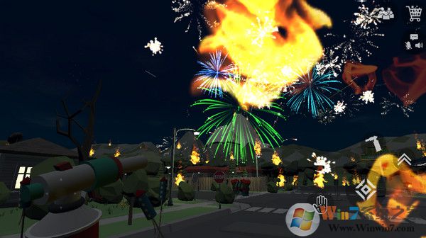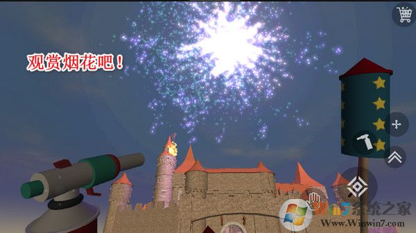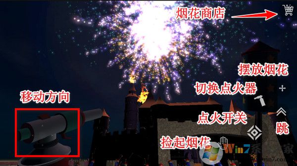 4、進(jìn)入地圖,現(xiàn)在正式開始教大家怎么操作煙花模擬器,屏幕左邊是移動,右邊的按鈕可以撿起煙花、擺放煙花、拿出點(diǎn)火器點(diǎn)火、跳躍,然后就是右上角的煙花商店按鈕