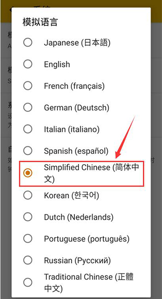 3、點擊模擬語言,模擬語言默認為English。