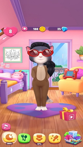 安吉拉也是需要美美的!除了日常的梳毛外,我們可以在化妝間里面,幫助安吉拉涂口紅、涂眼影、畫眉毛,每個化妝品都有不同的顏色和樣式,我們可以打造安吉拉的獨(dú)特風(fēng)格。只有你想不到,沒有游戲做不到。我們在游戲中可以幫助安吉拉換膚色,換發(fā)型,或者換日常的服裝,衣服的款式非常多,總有一款你喜歡。