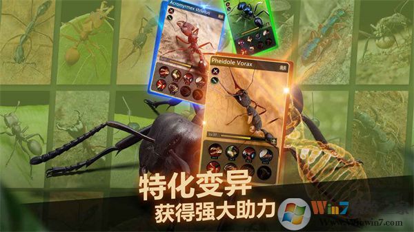 為了爭奪資源, 擴張勢力, 你必須組建強大的蟻隊, 而一支強大的隊伍里,除了眾多高等級的兵蟻, 還需要變異蟻領隊-特化蟻, 通過孵化異化卵可獲得強大的特化蟻。在兵蟻和特化蟻的強強聯(lián)手之下, 你的蟻隊必將勢如破竹, 粉碎你的敵人!