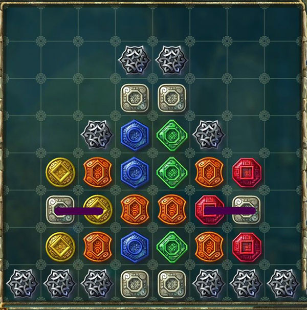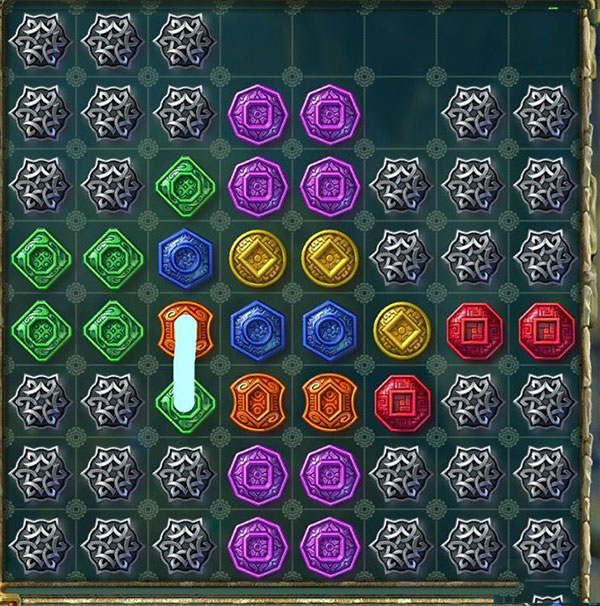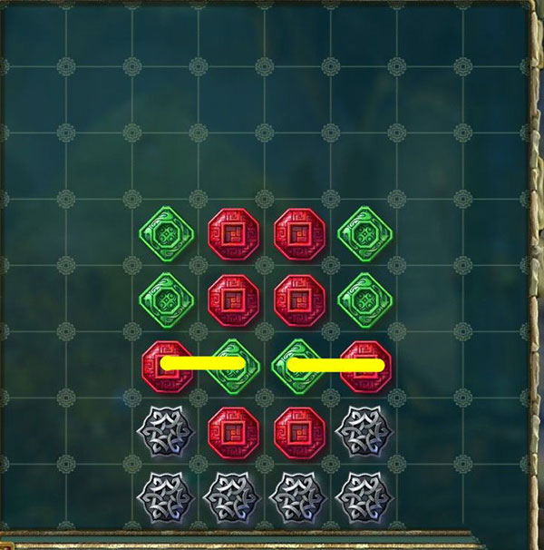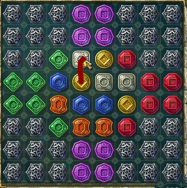 左半邊黃色寶石和最左邊的銀色寶石交換位置,形成三個(gè)連續(xù)的寶石就可以消除啦,右半邊跟左半邊一樣消除。