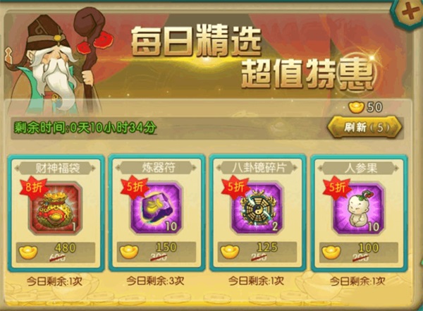 我們就以4次五折煉器符為例,一共可以購買獲得120個煉器符,共花費450*4+250=2050元寶,