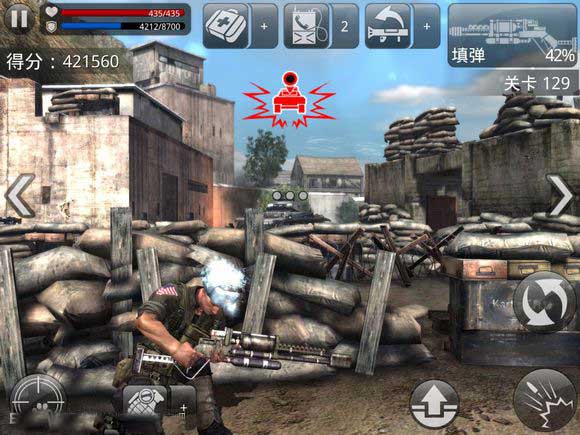 1、游戲采用終極第三人稱射擊視角,美輪美奐的畫面,精準(zhǔn)的控制操作以及先進(jìn)的物理特性。加入日益白熱化的戰(zhàn)爭,盡情享受IOS高清設(shè)備帶給您的極限體驗。2、從極易被摧毀的掩體向直升機、吉普車以及重兵把守的敵軍基地發(fā)起進(jìn)攻。在各種各樣的任務(wù)中,擊退一波又一波兇猛殘暴的敵人。