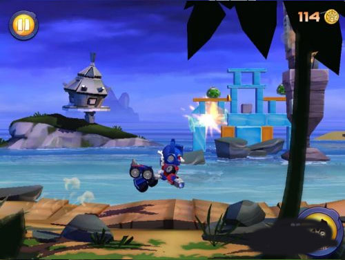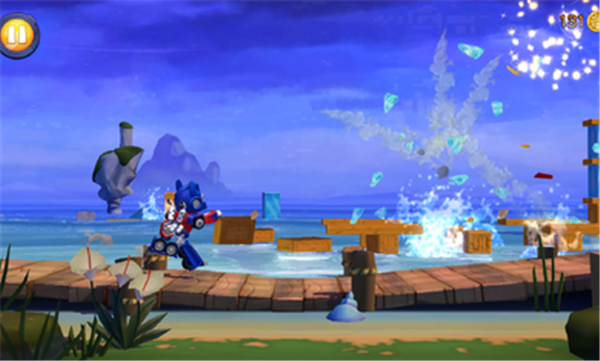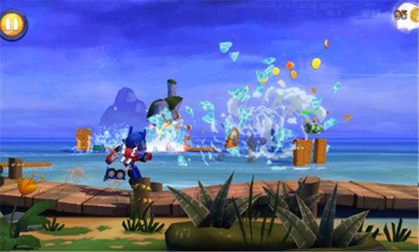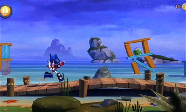 4、操控變形金剛鳥在跑酷時(shí)射擊,消滅躲在障礙物種的機(jī)械豬。
