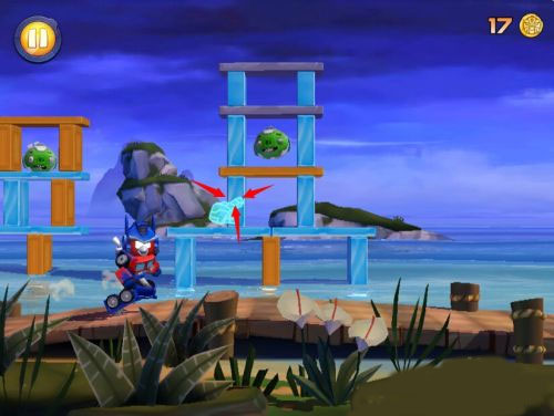 一般情況下綠豬都是在建筑物上面的,游戲前期玩家在沒有升級變形金剛的時(shí)候,攻擊力偏低,如果直接攻擊綠豬的話,可能并不能在該屏幕跑酷過程中造成擊殺。所以玩家只需要擊碎屏幕紅色方框“玻璃”,建筑物會倒塌,綠豬都將會葬身大海,按照冰塊>木塊>石塊的優(yōu)先順序進(jìn)行射擊。
