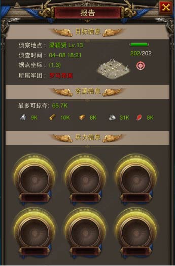 2、攻擊前最好先對(duì)該玩家城市進(jìn)行偵查,查看可掠奪的資源總數(shù)和玩家的防守陣型。以便針對(duì)性配置陣型,并衡量投入產(chǎn)出比。