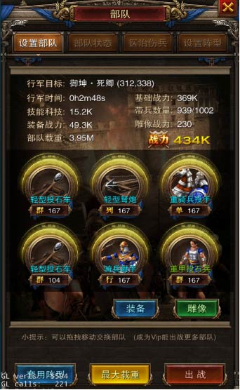 3、點(diǎn)擊【攻擊】,會(huì)進(jìn)入戰(zhàn)斗部署界面,可以將空閑的士兵拖到編隊(duì)中,并配置裝備和雕像資源。也可以通過(guò)【最大戰(zhàn)力】和【最大載重快速】編隊(duì),部隊(duì)的載重能力越強(qiáng),可掠奪的最大資源越大,掠奪資源的速度也會(huì)越快。