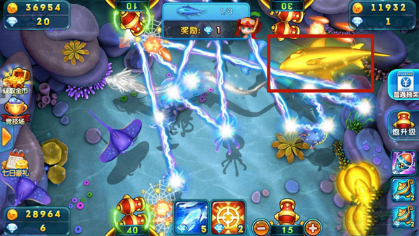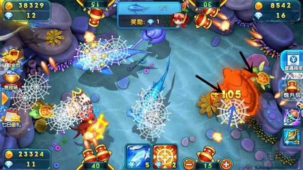 1、攻打慢魚游得很慢的魚,其實就是送分魚,對于這類在你眼前悠哉悠哉游過去的魚,趕緊調(diào)整好炮臺方向發(fā)起攻擊。這類魚一般有烏龜、比目魚、魔鬼魚等,看到在你面前游過,絕不能放過。