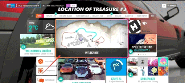 2、進(jìn)入世界地圖,尋找財(cái)富島寶藏2,選擇獲取財(cái)富島寶藏2路線,再查看比賽用 的車型。