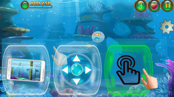 2、慢慢的我們越來越多,通過選擇三種移動按鍵來操作小魚越來越大。