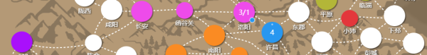 許昌上面的數(shù)字4表示城內(nèi)有4名武將,4上面的灰色小點(diǎn)表示城內(nèi)還有空閑武將。洛陽(yáng)上面的數(shù)字表示城池有3名武將1名間諜。右下角的藍(lán)色小圈表示城內(nèi)有我方派去的間諜