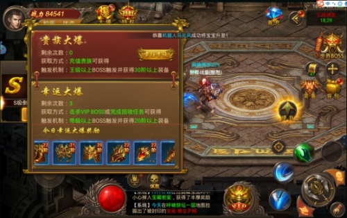 只需擊殺王級以上BOSS觸發(fā)大爆即可獲得,并且爆出的裝備都是25階以上的裝備(隨著等級的提高,后期游戲所接觸的BOSS級別和等級也會越高,有著貴族大爆次數(shù)的玩家,在完成任務(wù)或者刷BOSS的同時,也能體會到驚喜的感覺)有資源后持續(xù)更新完善!
