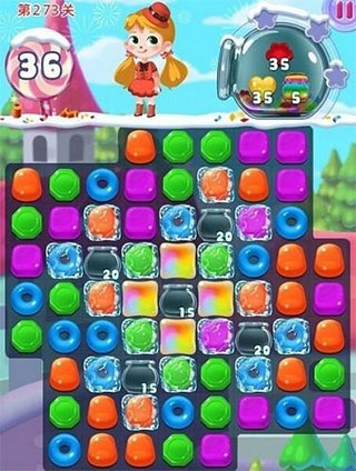 冰塊障礙會(huì)凍住里面的糖果,使它無(wú)法移動(dòng)和交換。玩家需要和冰塊里面的糖果進(jìn)行匹配消除來(lái)破壞掉冰塊。