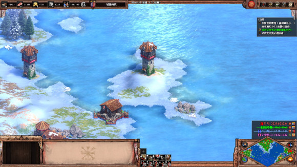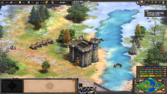 3、 建城墻把三座橋封死, 然后升城堡時代到9點中的淺灘造兩座城堡, 發(fā)育一段時間后就可以反攻了。 兩個敵人都沒什么守軍, 城堡時代就可將迦菲奇殺死, 然后攻克摩爾人的陣地, 把車領(lǐng)出來, 送回家過關(guān)。