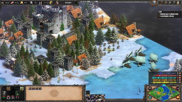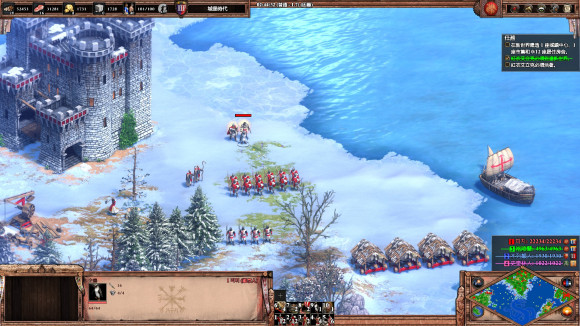 4、然后在格陵蘭島西岸新建船塢和運輸船,準備登陸文蘭在8點鐘方向有一小島, 島上有個英雄叫伯德, 是一個開發(fā)者的名字, 把他收了 (老版只能殺死), 帶著大軍登陸紐芬蘭島。 先建個城堡, 然后把島上的阿爾岡昆武士 (本質(zhì)是靛藍突襲者) 和民兵都吸引到城堡底下解決, 然后不需要蓋什么房子TC的, 直接派兵把紫色原住民的TC和兵營拆除即可勝利。