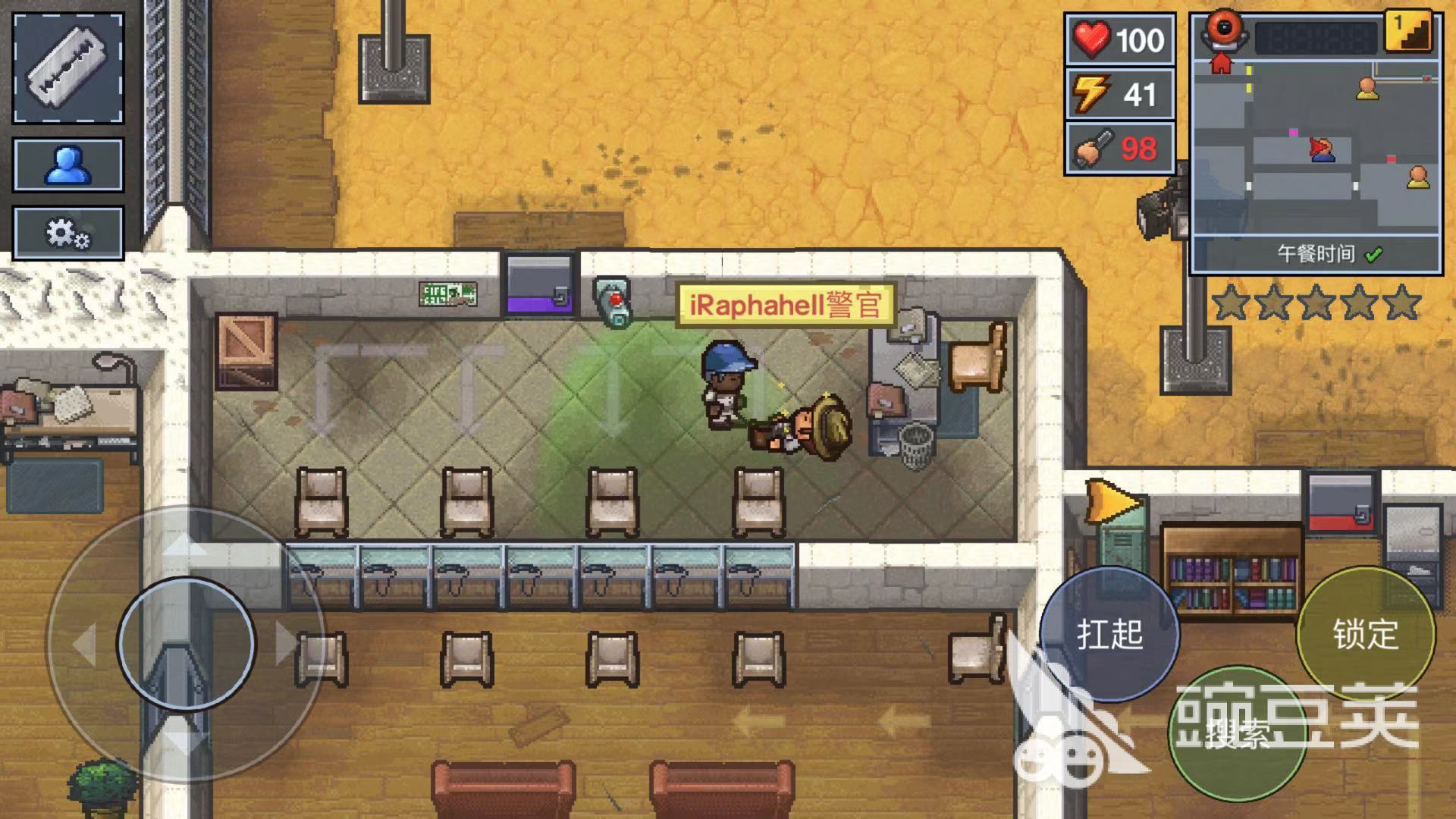 第五步:找警察打架,打完之后看看他身上有沒有各色鑰匙,有點(diǎn)話趕緊拿起來,使用鑰匙和制作鑰匙的模板合成獲得可以使用的鑰匙,再將鑰匙還回給警察。這樣就獲得一種顏色的鑰匙了,其他顏色的鑰匙同理。